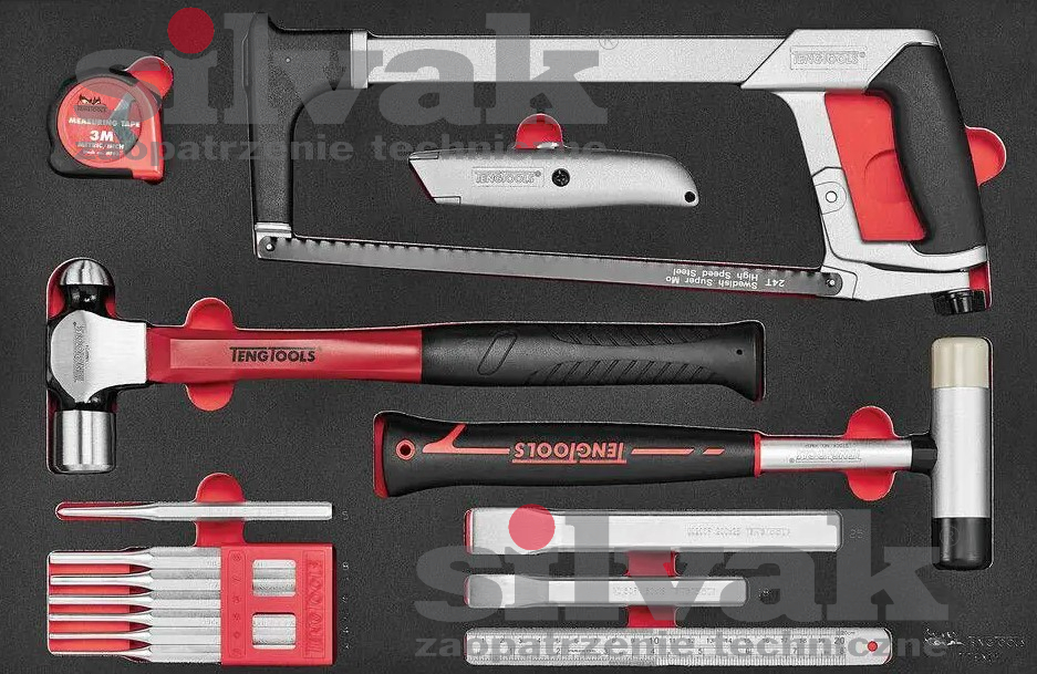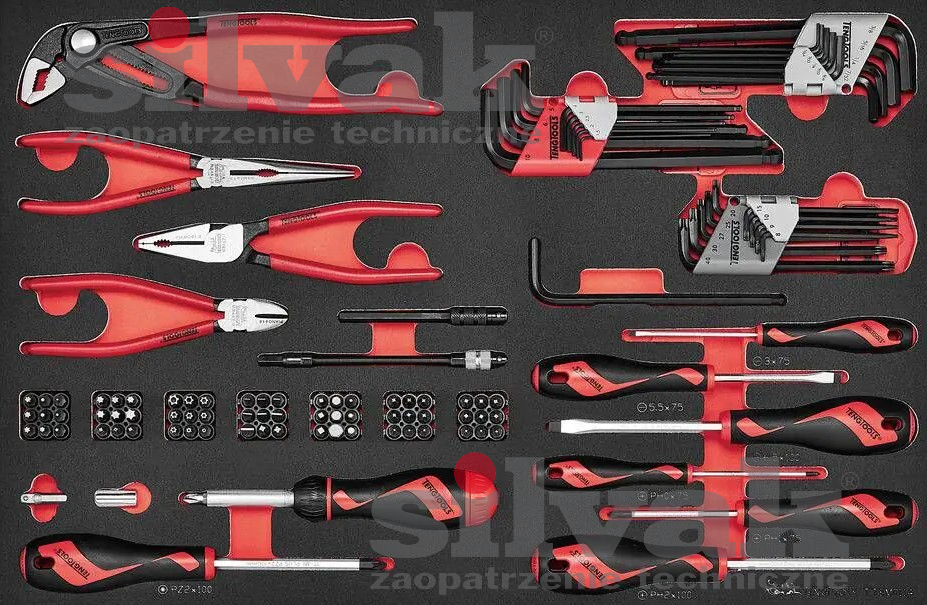 Narzędzia są uporządkowane w piankowych wkładkach EVA, co zapewnia szybki dostęp i kontrolę braków. W zestawie znajdziesz nasadki metryczne 4–24 mm, grzechotki 72‑zębowe, klucze płasko‑oczkowe, imbusowe i TX, a także młotki, szczypce, dłuta, piłę do metalu i pełny zestaw wkrętaków z bitami.