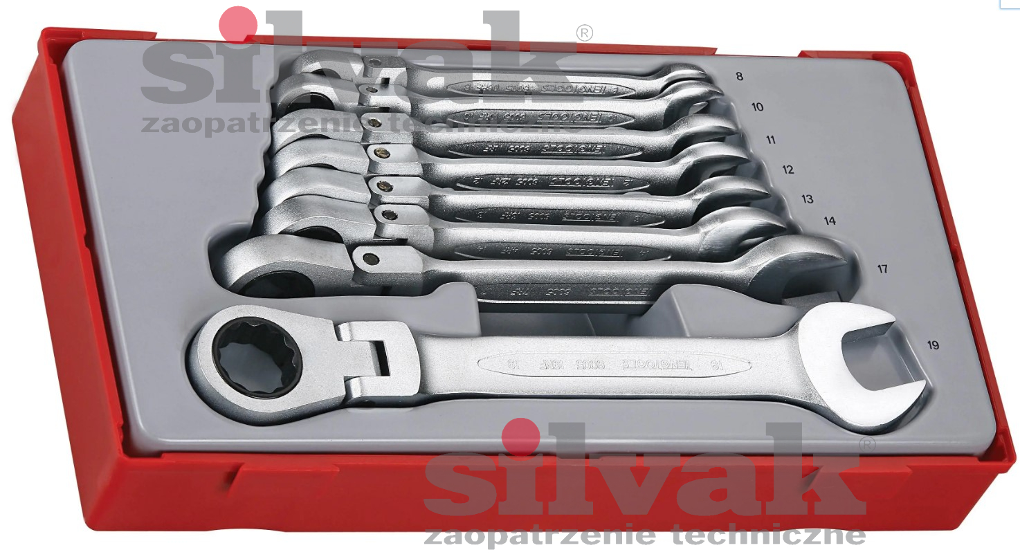 Teng Tools prezentuje zestaw 8 kluczy przegubowych płasko‑oczkowych z zapadką, wykonanych ze stali chromowo‑wanadowej. Każdy klucz posiada główkę oczkową przechylną w zakresie 180°, co umożliwia pracę pod różnym kątem. Ten sam rozmiar na obu końcach zapewnia prostą obsługę, a zmiana kierunku działania zapadki odbywa się poprzez przełożenie klucza na drugą stronę. Zestaw dostarczany jest w praktycznym pojemniku z odłączaną pokrywą, kompatybilnym ze skrzynkami i wózkami Teng Tools.