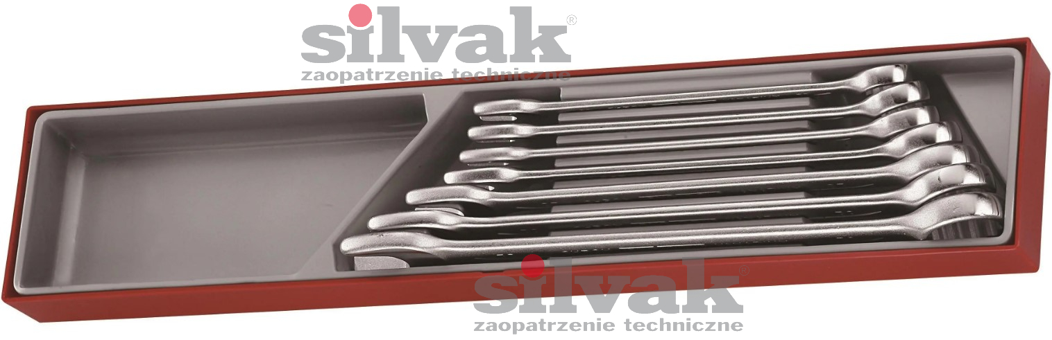 Teng Tools TTX2032 to zestaw 7 kluczy płasko‑oczkowych w rozmiarach metrycznych od 20 do 32 mm. Wykonane ze stali chromowo‑wanadowej, satynowane i chromowane dla zwiększonej trwałości. Każdy klucz posiada dwunastokątną główkę pierścieniową odgiętą pod kątem 15°, co ułatwia pracę na płaskich powierzchniach. Zestaw dostarczany jest w praktycznym module narzędziowym, pasującym do skrzynek i wózków Teng Tools.