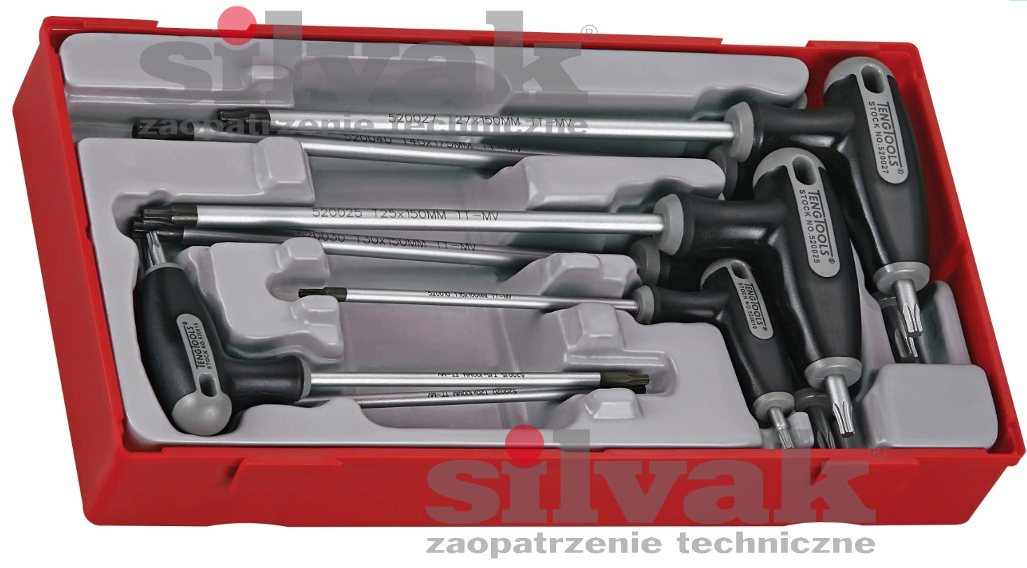 Teng Tools TTTX7 to zestaw 7 kluczy TX z rękojeścią poprzeczną, przeznaczonych do pracy z gniazdami systemu TX, także tymi wyposażonymi w centralny czop. Każdy klucz posiada dłuższy koniec z końcówką TPX do gniazd zabezpieczonych przed niepowołanym użyciem oraz standardową końcówkę TX na krótszym końcu, umożliwiającą przyłożenie większego momentu obrotowego. Zestaw dostarczany jest w praktycznym pojemniku z odłączaną pokrywą, kompatybilnym ze skrzynkami i wózkami Teng Tools.