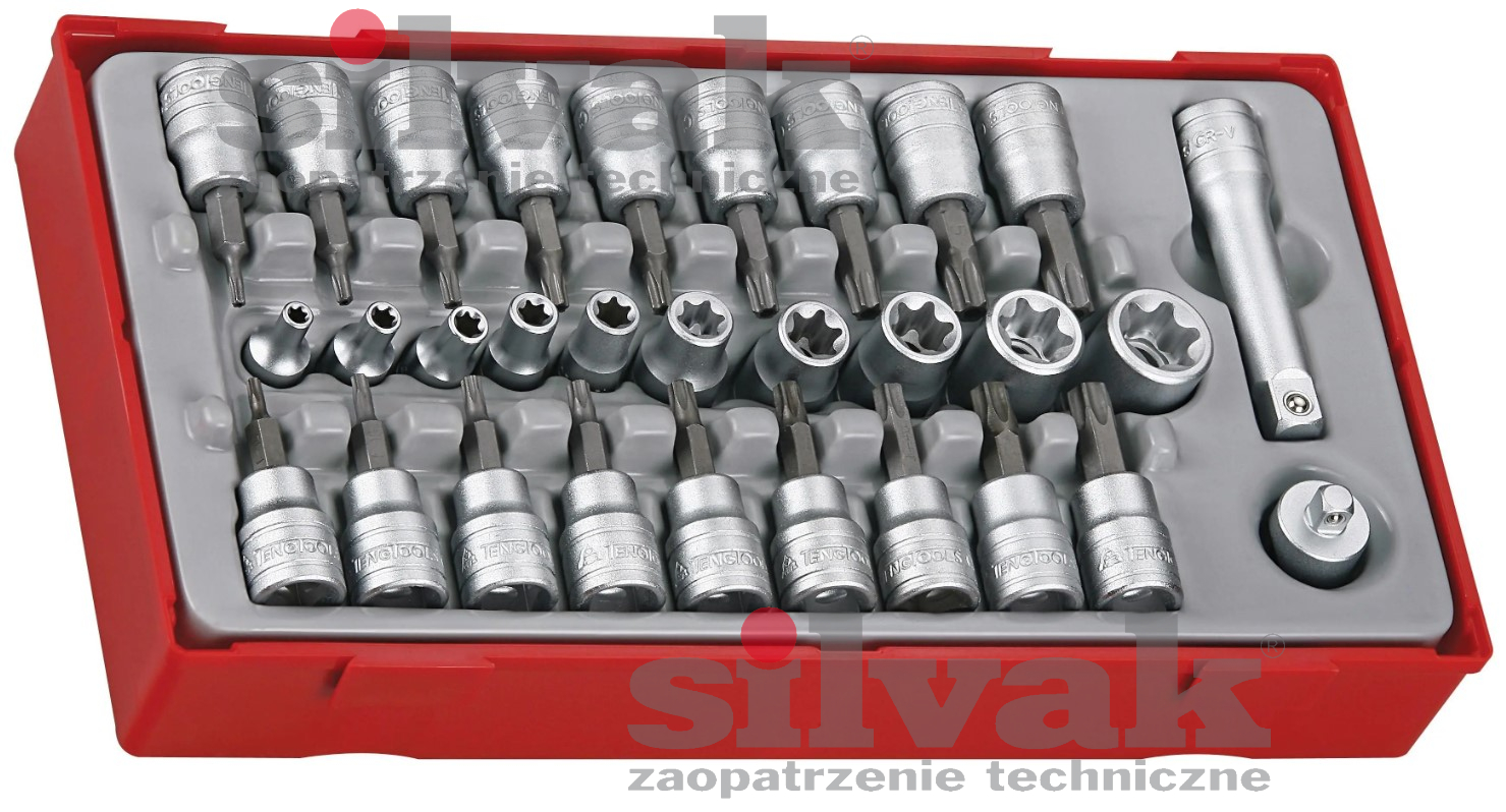 Teng Tools TTTX30 to zestaw 30 elementów obejmujący nasadki trzpieniowe i gniazdowe, przeznaczony do pracy z gniazdami systemu TX. W komplecie znajduje się łącznik redukcyjny 3/8"–1/4", przedłużacz 3/8" o długości 75 mm oraz 28 nasadek typu TX, TPX i TX‑E w różnych rozmiarach. Wszystkie elementy wykonane są ze stali chromowo‑wanadowej, satynowane i zgodne z normami DIN oraz ISO. Zestaw dostarczany jest w praktycznym pojemniku z odłączaną pokrywą, pasującym do skrzynek i wózków Teng Tools.